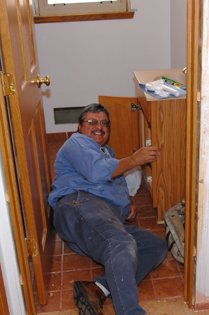 Jaime Castro laying the new kitchen ceramic floor tile